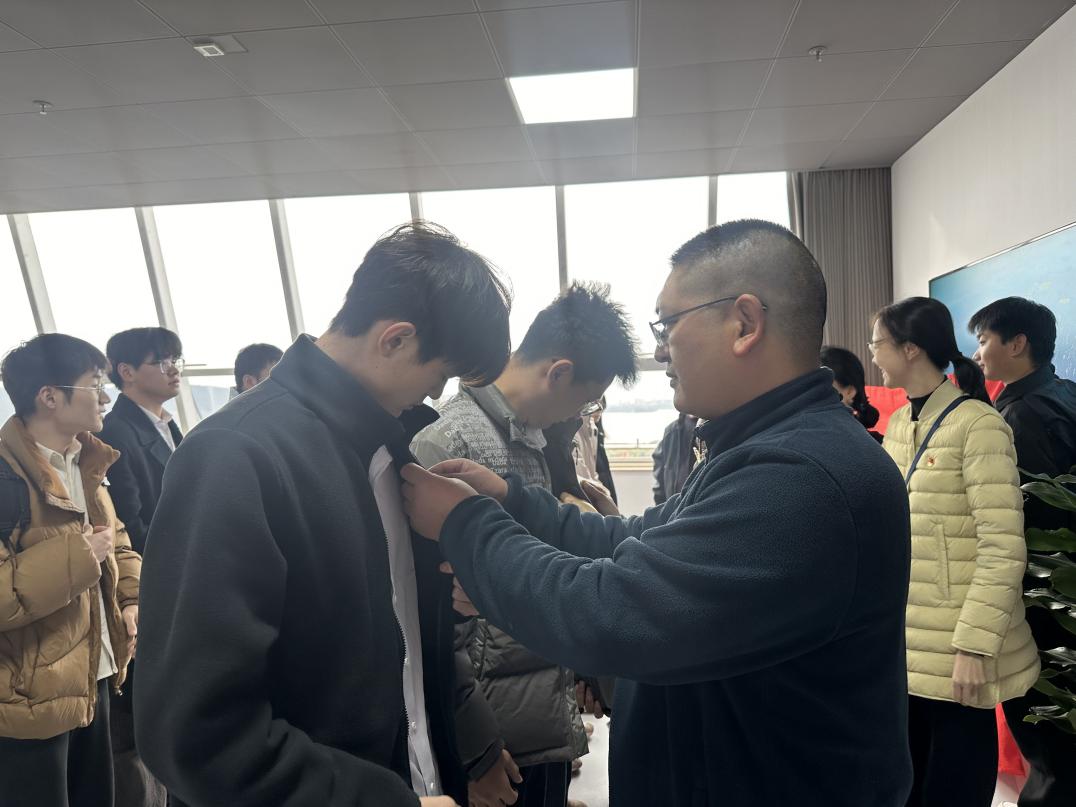 紧接着,我支部全体党员给新入党的学生党员逐一佩戴党徽。